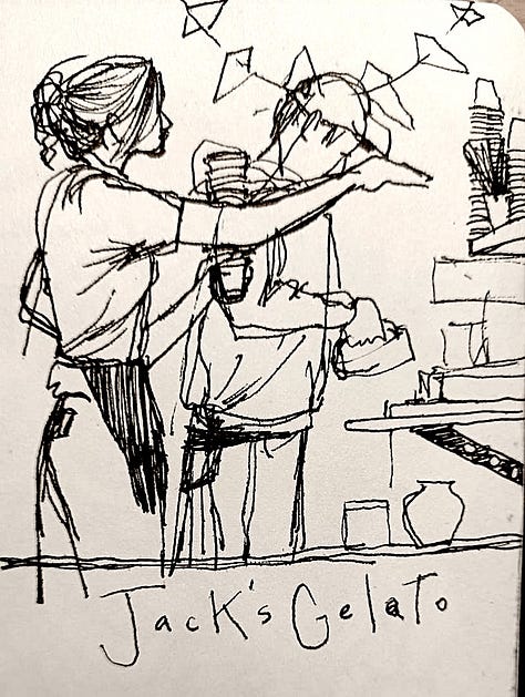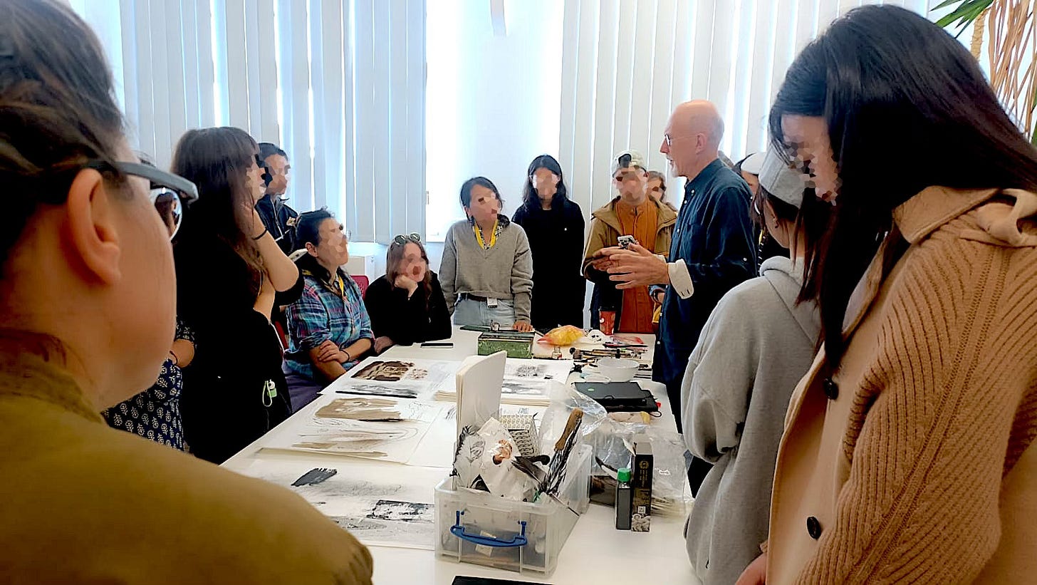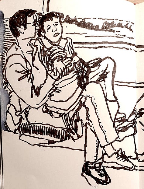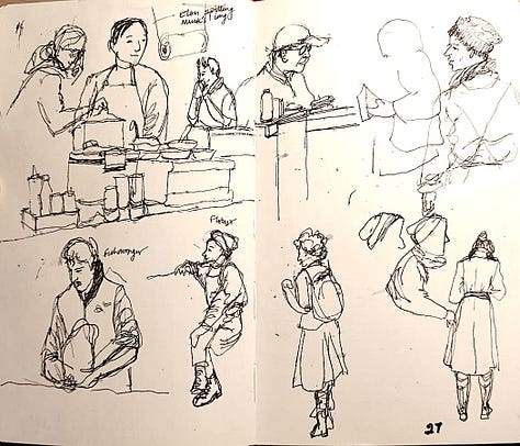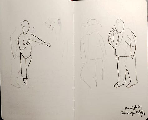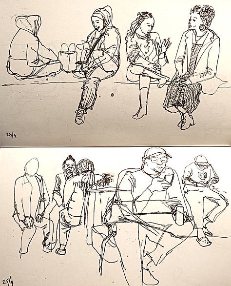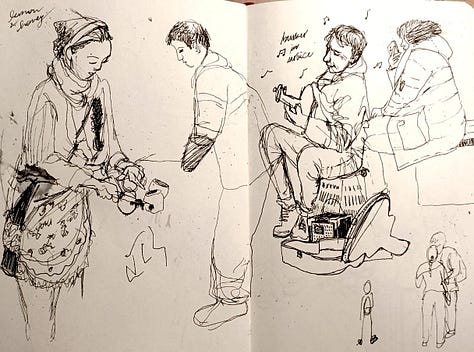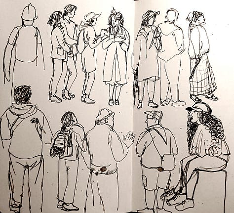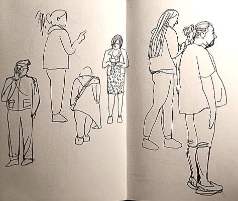 Okay, don’t panic, deep breath, turn the page, start again! This time, I consciously acknowledged the fear of judgement, reasoned it’s just my personal sketchbook - hopefully the worse it is right now, the more spectacular the end will look (oh, the stories I tell myself!) Unsurprisingly however, the sketches got better. Our tutor Pam came by and helpfully pointed out what I was missing - capturing the character of drawn subjects enough so the viewer can see what I was seeing in the moment. By the end of the day, I was kinda happy with the kind of start I’d had.