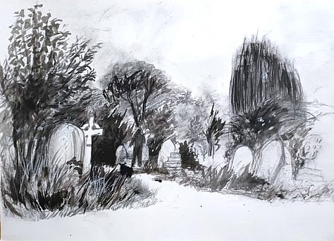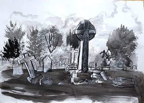 The working location for the day was a cemetery - fitting, since we were only allowed to use black paint/ink/pencils/crayons/... We sat ourselves down amidst gravestones and painted/mark-made our lives to hell. This time around, I remembered to take photos of all the (dark) magic!