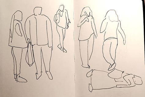 The cold grey weather did nothing to dampen my spirits as we walked to a nearby street to sketch outdoors, scattered along the entire street as passers-by gawked. I’d done observational sketching twice before - once during graduation, and more recently during the Riyaaz illustrators’ course. A sense of déjà vu descended as my pen stood poised on the page - ready to capture the incoming stream of people. Quickly, I made one sketch, then another, and then another…