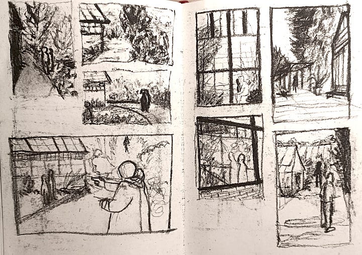 We made our way to the Cambridge Botanical Gardens to work on thumbnail sketches incorporating interesting framing and composition. But the photographer in me went to munch on grass (Hindi: ghaas charne gaya) it seemed - I felt so inadequate, frozen, unimaginative. Drawing in the pouring rain, cold and hunched under an umbrella didn’t help either - my charcoal sketches progressively began to look as muddled as the ideas in my head.