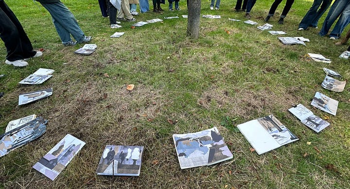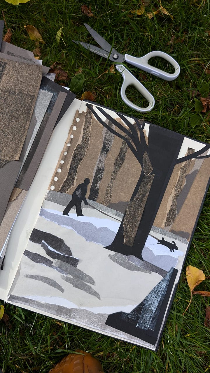 The exercise was to make an observational collage from these papers in a park. No drawing - just cut the shapes and stick. It was back-breaking but SO SO satisfying. The results from everybody were astounding! Check out Hsihui Lin’s below: